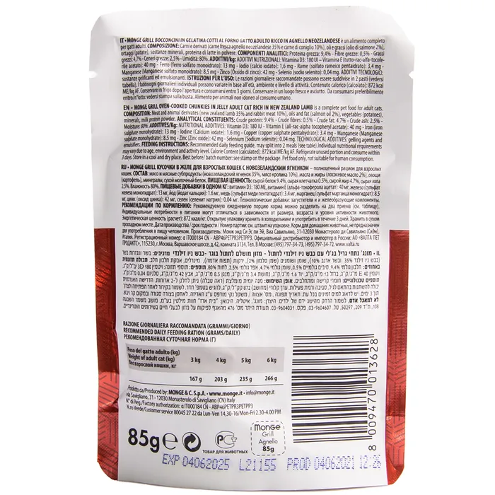 Monge (Монж) Cat Grill полнорационные беззерновые паучи из новозеландского ягненка для взрослых кошек и котов 85г.
