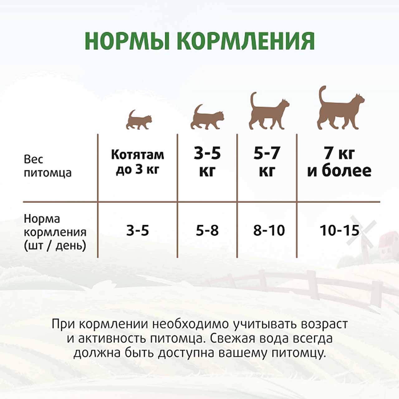 Норма потребления: котятам с 3 месяцев и взрослым кошкам весом до 3 кг — от 3 до 5 подушечек в день, взрослым кошкам весом от 3 кг до 5 кг - 5 - 8 подушечек в день, взрослым кошкам весом от 5 кг до 7 кг - 8 - 10 подушечек в день, взрослым кошкам весом более 7 кг - 10 - 15 подушечек в день.