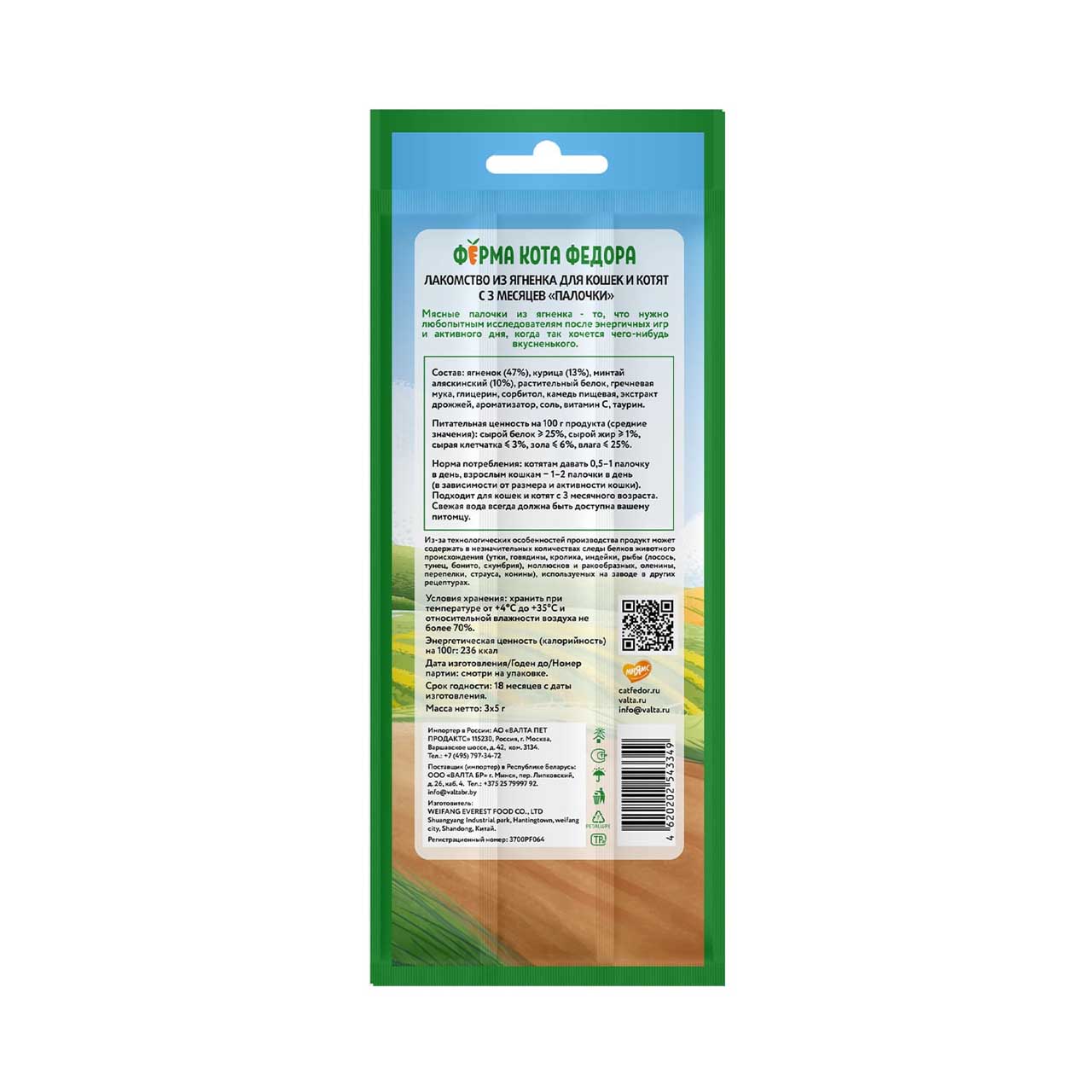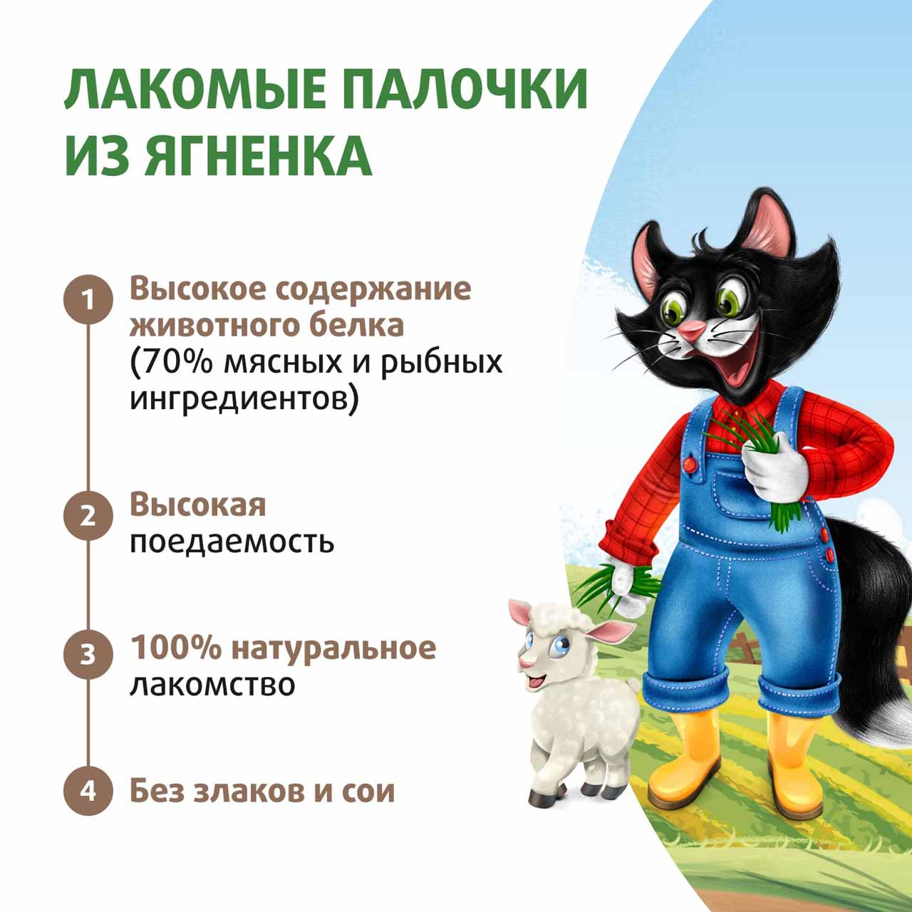 Лакомые палочки "Ферма кота Федора" из ягненка - то, что нужно любопытным исследователм после энергичных игр и активного дня, когда так хочется чего-нибудь вкусненького. Натуральные ингредиенты с оптимальным количеством витаминов и минералов точно придутся по вкусу вашему питомцу. Палочки отлично подойдут как котятам, так и взрослым кошкам.