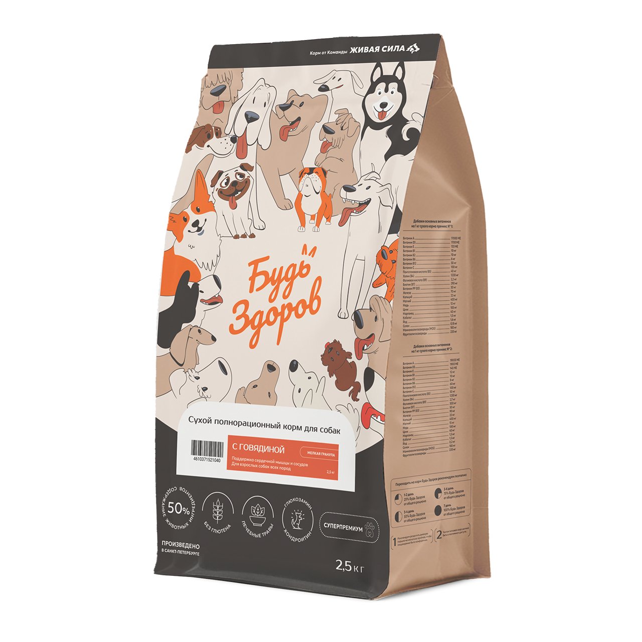 Будь Здоров с говядиной (мелкая гранула) - корм для взрослых собак, поддержка сердечно-сосудистой системы.