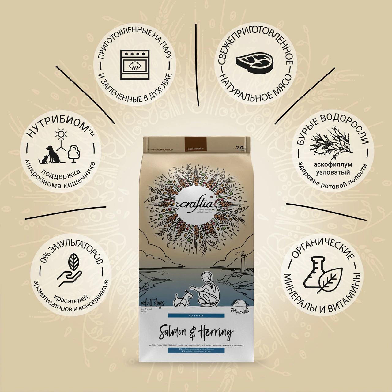 CRAFTIA NATURA сухой корм для взрослых собак миниатюрных и мелких пород из лосося с сельдью.