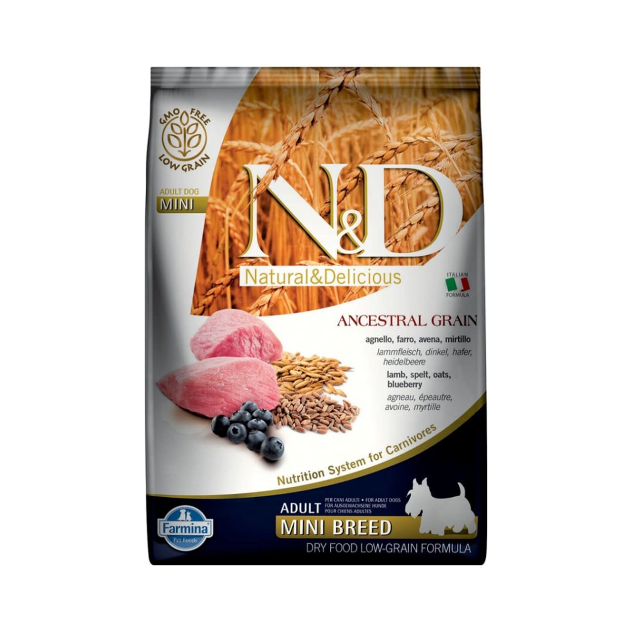 Farmina (Фармина) N&D Ancestral Grain Низкозерновой Ягненок, спельта, овес и черника - это полнорационный сухой корм для взрослых собак мелких пород.