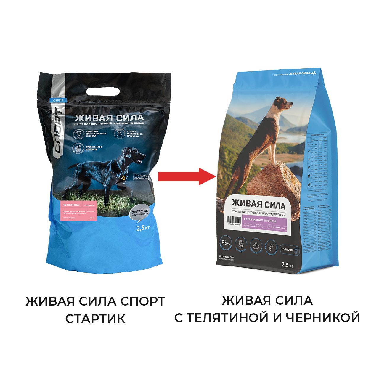Ваш рацион теперь называется Живая Сила Телятина и черника Сухой корм для щенков от 1 месяца. Мелкая гранула