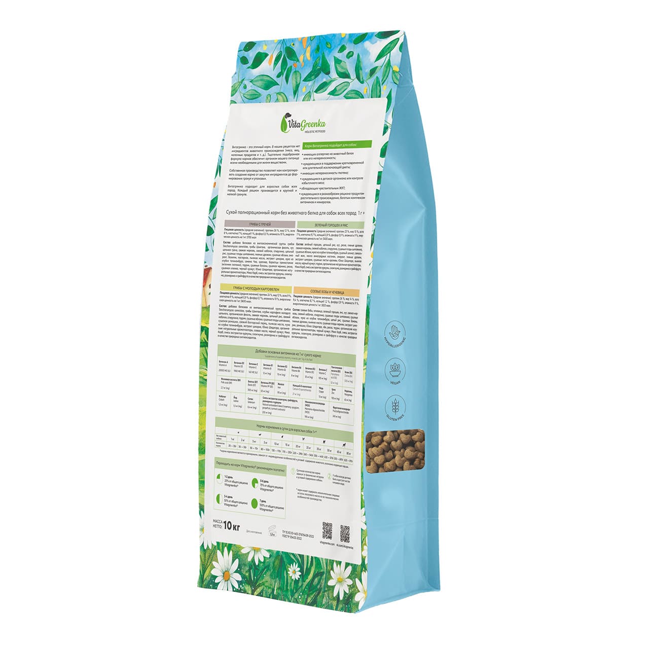 Vitagreenka Зелёный горошек и рис (крупная гранула) – это этичный корм для собак. В нем нет продуктов, имеющих животное происхождение.