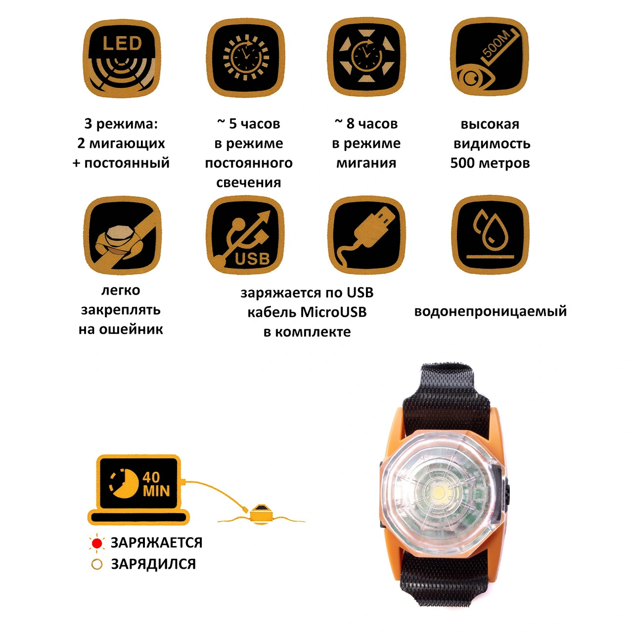 Время работы в постоянном режиме составляет примерно 5 часов, а в мигающем — около 8 часов. Высокая видимость — до 500 метров. Время зарядки по USB — 40 минут.