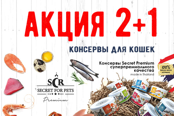При покупке 2 банок консервов для кошек SECRET Premium (Тайланд) одного рациона, третья банка аналогичного рациона в подарок!