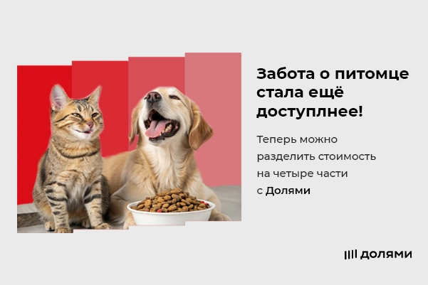 Специально для вашей экономии мы добавили новый способ оплаты Долями, который позволяет купить то, что хочется для любимого питомца, а оплату разделить на четыре части. При этом товар Вы получите сразу после оплаты первой доли. Остальные три платежа будут автоматически списываться с вашей карты каждые две недели, а перед каждым списанием вам будет приходить напоминание о дате платежа.Почему выгодно оплачивать покупки "Долями":
